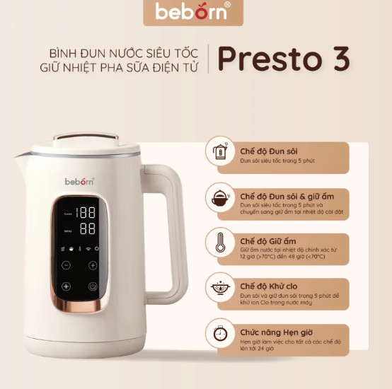 Là dòng ấm đun siêu tốc tiên phong của nhà Beborn, Presto 3 không chỉ đun siêu tốc và còn giữ ấm nước pha sữa như một máy đun và hâm nước pha sữa đa năng trên thị trường, vừa đa năng, vừa siêu tốc, vô cùng tiện lợi.