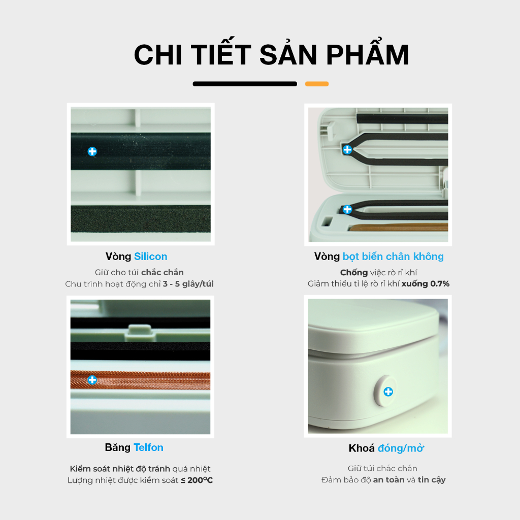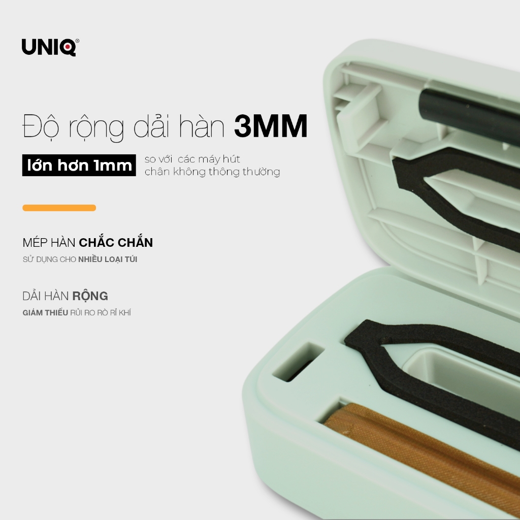 Ngoài ra Máy hút chân không mini của UNIQ còn có thiết kế kẹp túi thông minh, nút bấm cơ siêu bền, tiện dụng, công nghệ tự động hàn miệng túi nhám, lực hút của máy mạnh tới 65000 PA hút kiệt, dải hàn rộng 3mm khiến thực phẩm được lưu trữ lâu hơn bảo quản thông thường